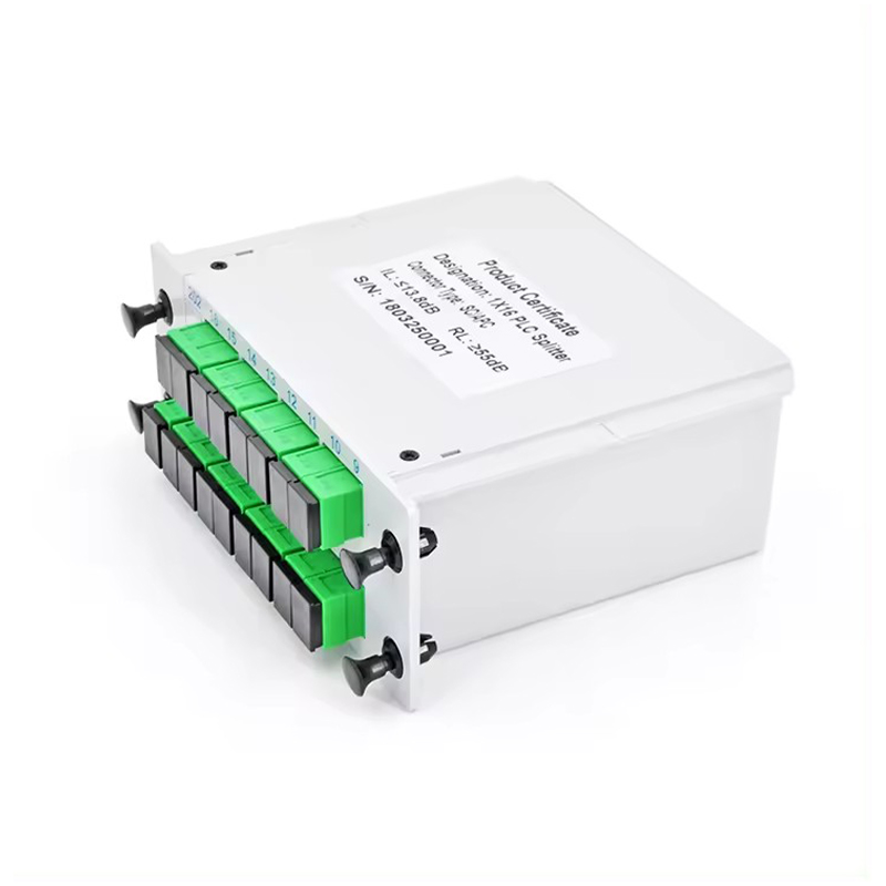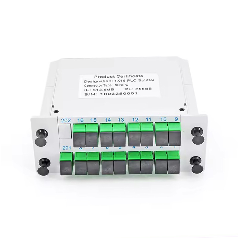 GSG-LGX-1x16-SC APC Fiber Optic PLC Splitter. Rozbočovač PLC založený na technologii integrovaného vlnovodu na křemenném substrátu se vyznačuje nízkou vložnou ztrátou, nízkou ztrátou závislou na polarizaci a dobrou rovnoměrností kanálu, což zajišťuje jeho stabilitu a spolehlivost v různých prostředích.